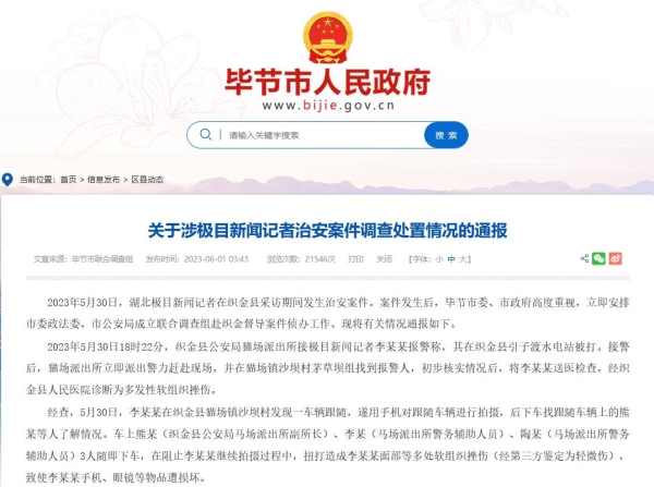 2023年5月30日,湖北极目新闻记者在织金县采访期间发生治安案件。案件发生后,毕节市委、市政府高度重视,立即安排市委政法委、市公安局成立联合调查组赴织金督导案...